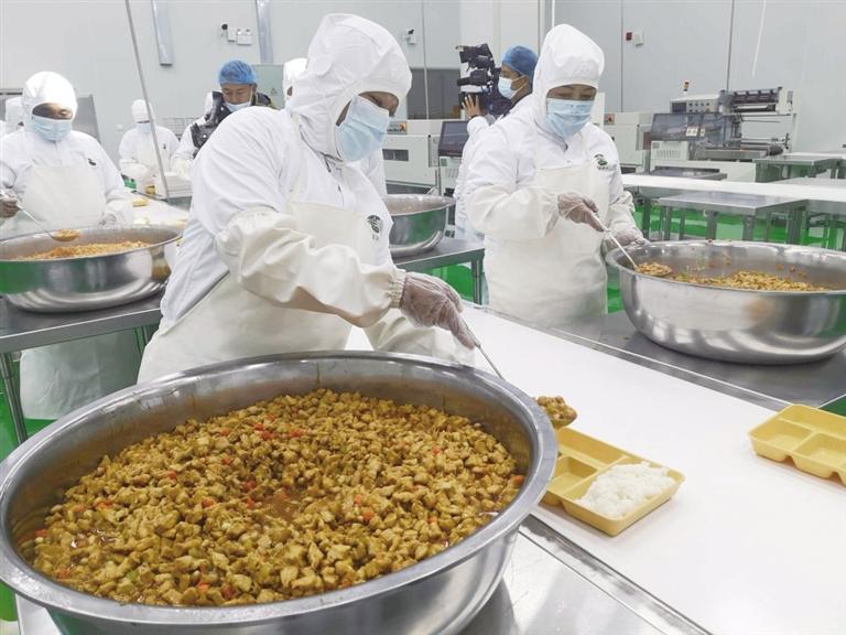 這些凈菜準備好后,通過設備轉運至熱菜烹炒車間,在這里有幾位廚師正在烹飪宮保雞丁、西紅柿炒蛋、青菜西紅柿湯等。這些凈菜經過加工之后被運送至分餐車間。餐盒經高溫消毒后,工作人員將每一份米飯、熱菜取樣留存,然后開始分工分餐,打包好的餐盒通過加溫消毒后,裝進保溫箱,運送至配餐車內。