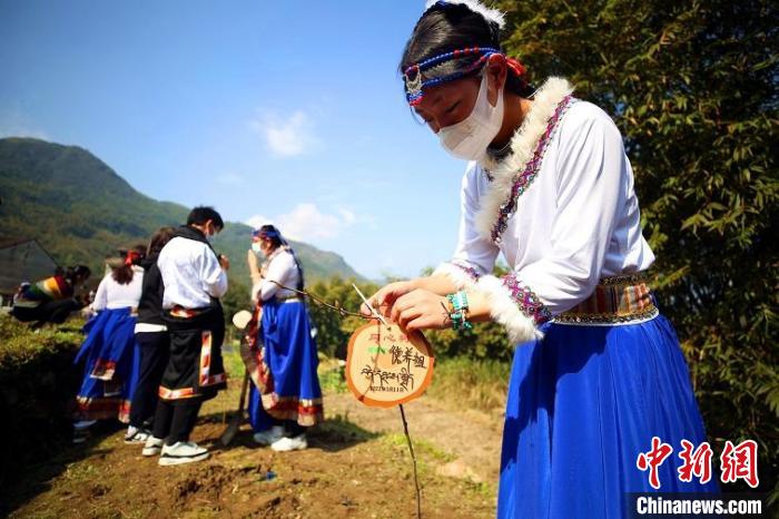四川阿壩學(xué)子在浙江瑞安植樹(shù),并懸掛“同心樹(shù)”牌。王志 攝