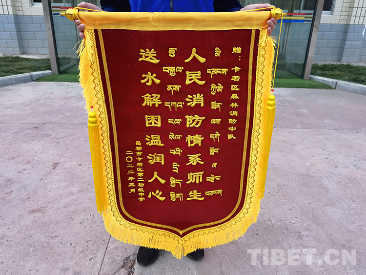 中國西藏網訊 一面錦旗,凝聚著群眾對消防隊伍誠摯的謝意和真摯的情感。4月1日,西藏自治區昌都市卡若區森林消防中隊迎來了一批“特殊的客人”(昌都市第二初級中學的師生代表),他們將一面繡有“人民消防情系師生 送水解困溫潤人心”的錦旗贈送給中隊全體人員,向中隊全體消防救援人員表示衷心感謝。