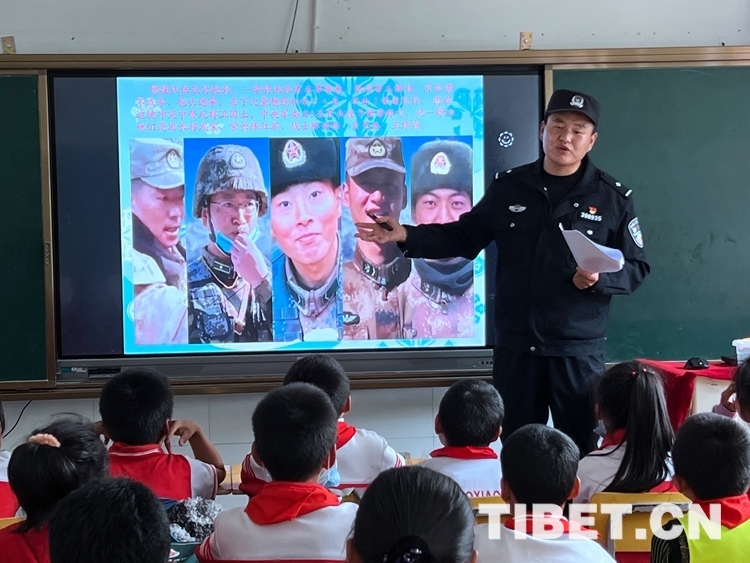 中國(guó)西藏網(wǎng)訊 “同學(xué)們,大家知道照片上這位英雄是誰嗎?”伴隨著民警周升展的提問聲,孩子們紛紛舉起手回答出了這位英雄——祁團(tuán)長(zhǎng)。“你們真聰明,今天叔叔給大家講一講新時(shí)代衛(wèi)國(guó)戍邊英雄祁發(fā)寶團(tuán)長(zhǎng)的故事……”