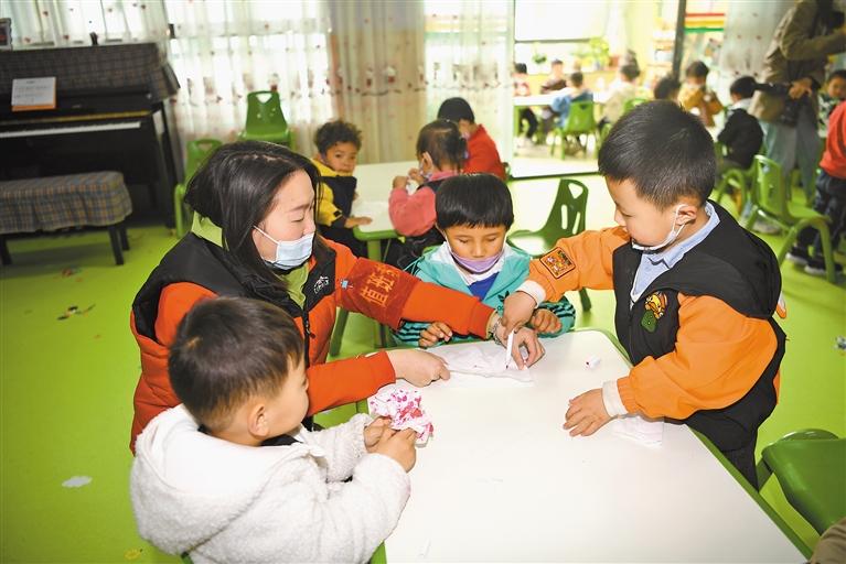 圖為孩子們在老師指導下為媽媽制作禮物。記者 王敏 攝