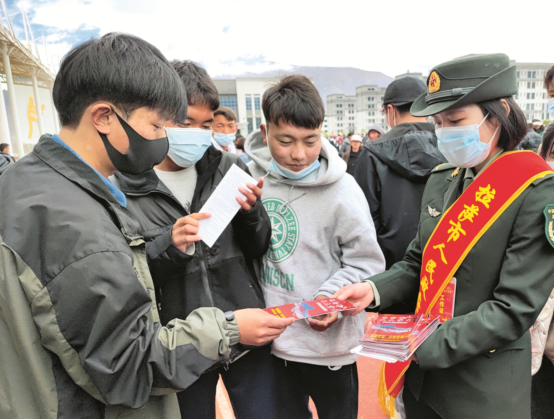 圖為市征兵辦工作人員向學生發放征兵宣傳資料。拉薩融媒記者 凃 瓊攝