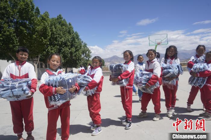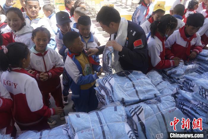 圖為拉薩出入境邊防檢查站的民警為學生發放校服。 貢嘎來松 攝