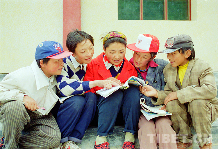 這是嘉黎縣中學學生在課余時間相互學習交流。該校由寧夏回族自治區和新疆維吾爾自治區共同援建(唐召明1997年攝)