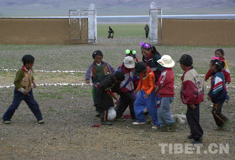 這是雙湖特別區(從雙湖辦事處改名而來,現為雙湖縣)嘎措鄉小學學生在課余時間踢足球(唐召明2001年攝)
