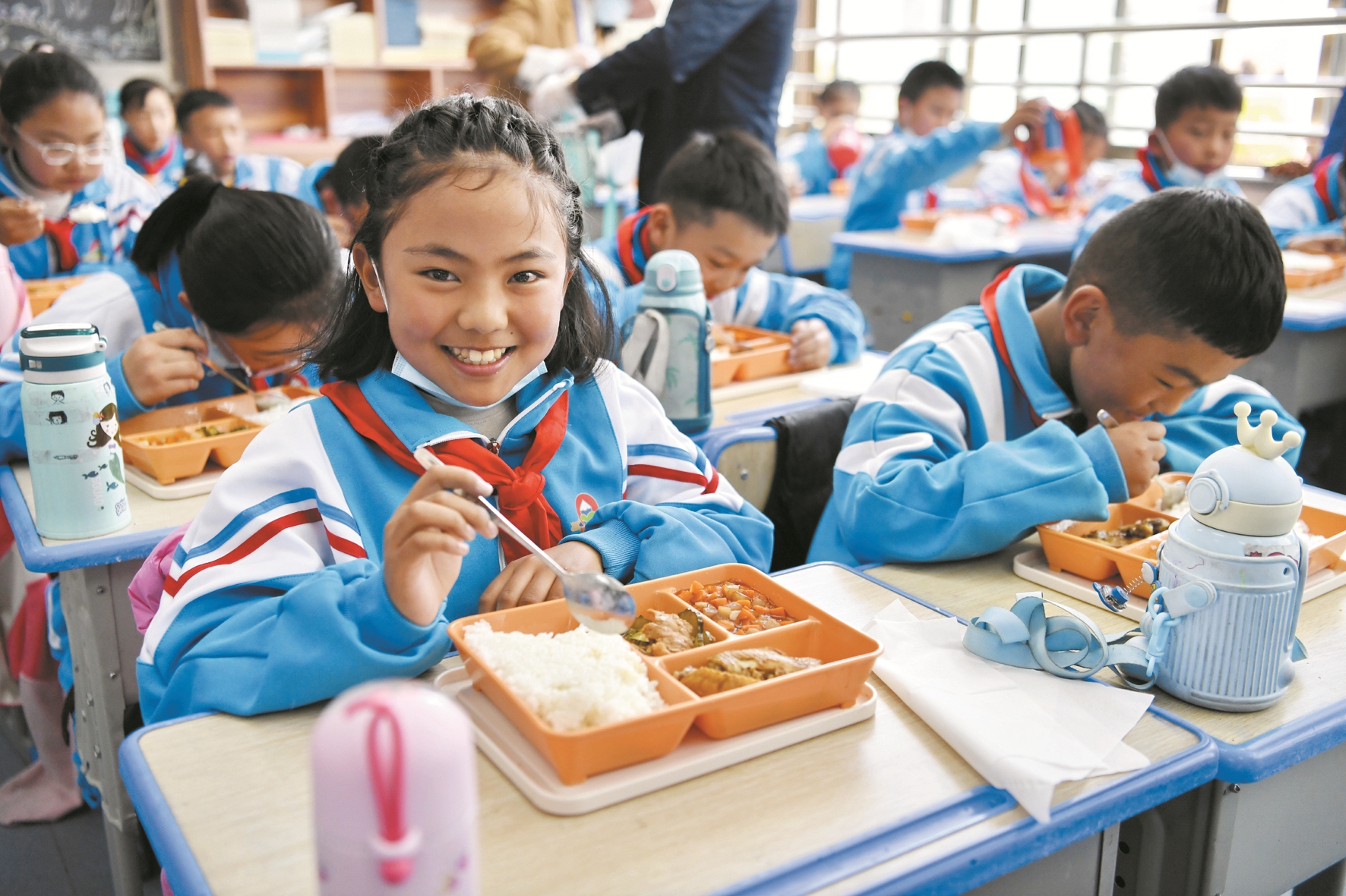 圖為拉薩市實驗小學東城分校小學生在享用營養午餐(5月12日攝)。新華社記者 張汝鋒攝