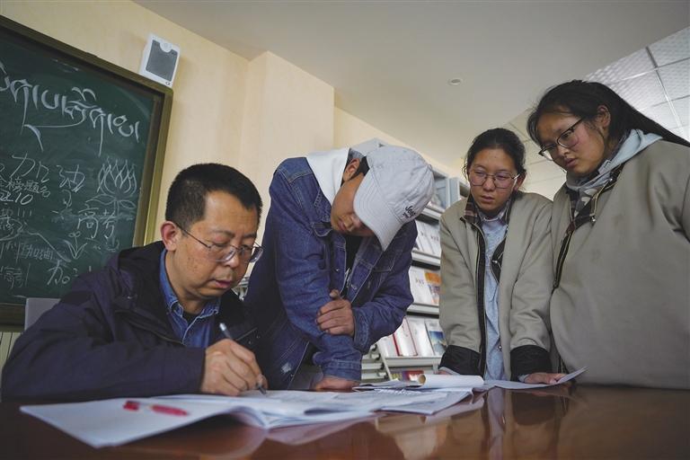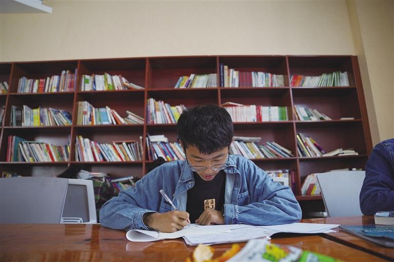 除了教室,閱覽室也是學習的好地方。在閱覽室,不少同學正奮筆疾書,只聽得見書頁翻動和筆尖書寫的“沙沙”聲。陽光透過玻璃傾瀉在書桌上,暖暖地照在這些青春的面龐,把他們點綴成五月里最美的風景。閱覽室的最里邊,一位老師正在認真講解試卷上的難題,不一會兒同學們就露出了恍然大悟的表情。“我很喜歡來閱覽室學習,這兒比教室更安靜些,可以讓我靜下心來做題。”學生扎西江村說。
