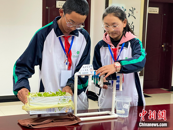 圖為智慧社區中學組參賽選手向評委老師展示作品《太陽能自動澆灌系統》的工作原理。 中新社記者 趙朗 攝