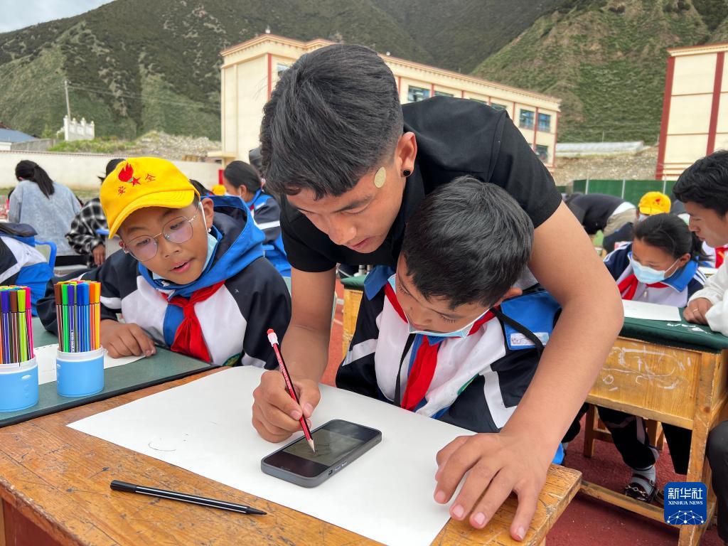 西藏大學美術專業學生為工布江達縣小學孩子們輔導繪畫。(受訪者供圖)