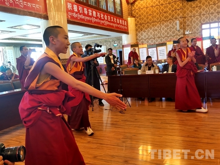 據了解,與傳統寺廟教育相比,西藏佛學院開設有文化課和佛學兩大體系,天資聰慧的少年活佛們在校期間已經開始研習含義深刻、博大精深的《五部大論》《入菩薩行論》等佛教經典作品,目前已經可以流暢地背誦部分經典。在當日的學習成果匯報展示會上,少年活佛們不僅展示了藏漢雙語朗誦、藏漢文書法、英語情景劇等,也為大家帶來了《入菩薩行論》第一章的背誦展示和辯經展示。