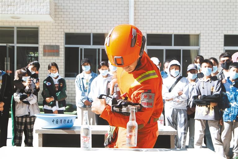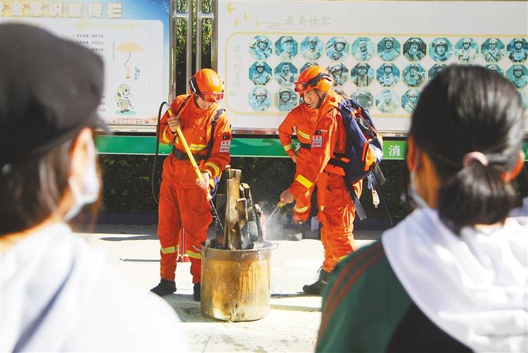 消防員就裝備正確使用方法進行演示。通訊員 徐嘉陽 記者 謝筱純 王珊 張猛 攝