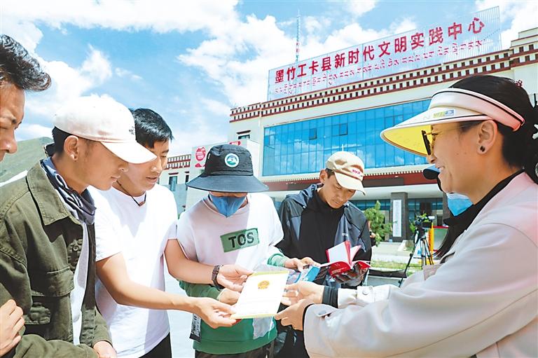 近日,墨竹工卡縣開展新時代文明實踐志愿服務活動。在活動現場,各參與單位為群眾發放宣傳手冊、書籍和雨傘、水杯等物品,向群眾宣傳講解相關知識,還以免費理發、免費修電腦等方式為現場群眾開展了送溫暖、送科技、送法律活動,進一步提高了群眾對各項政策的知曉度,豐富了群眾的文化生活。
