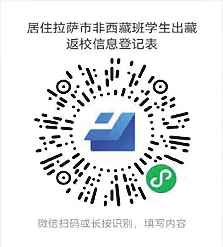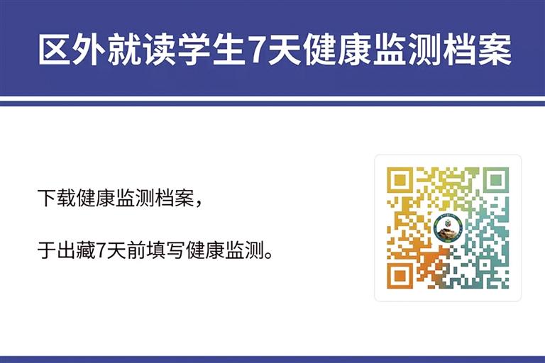 另外,居住在拉薩市的區外就讀西藏籍大學生、區外非西藏班就讀西藏干部職工子女、區外就讀進城務工人員子女、旅居區內的區外學生出藏返校,須嚴格執行《西藏自治區高風險區 中風險區 低風險區疫情精準防控辦法》,關于“高風險區實行封控管理,原則上人員及車輛不進不出;中風險區實行‘人不出區、嚴禁聚集’,原則上人員及車輛只進不出;低風險區內人員原則上非必要不離開本區域,如因就醫、特定公務等確需出入的,須持24小時內核酸檢測陰性證明”要求。在此提醒廣大家長和學生,出藏返校須咨詢現居住地所在村(居)委會防疫要求,嚴格落實“三天兩檢”核酸檢測、藏易通綠碼等監測程序,密切關注民航、鐵路等交通部門出行要求和目的地疫情防控政策,在滿足出藏防疫規定的前提下,進行出藏信息登記和“7天健康登記”(詳見文末二維碼),確定出藏行程。