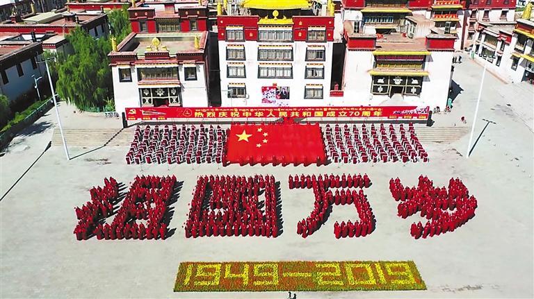 引導(dǎo)宗教界人士爭(zhēng)做愛黨愛國(guó)愛人民、堅(jiān)決維護(hù)祖國(guó)統(tǒng)一和民族團(tuán)結(jié)的模范。圖為2019年10月1日,西藏自治區(qū)昌都強(qiáng)巴林寺僧人以自己的方式表達(dá)對(duì)中華人民共和國(guó)成立70周年的祝福。