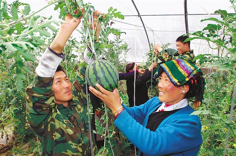 各族群眾廣泛交流、互幫互助、深度交融,共同創(chuàng)造美好幸福生活。圖為西藏自治區(qū)白朗縣彭倉(cāng)村群眾與山東壽光技術(shù)人員共同種植的西瓜喜獲豐收。