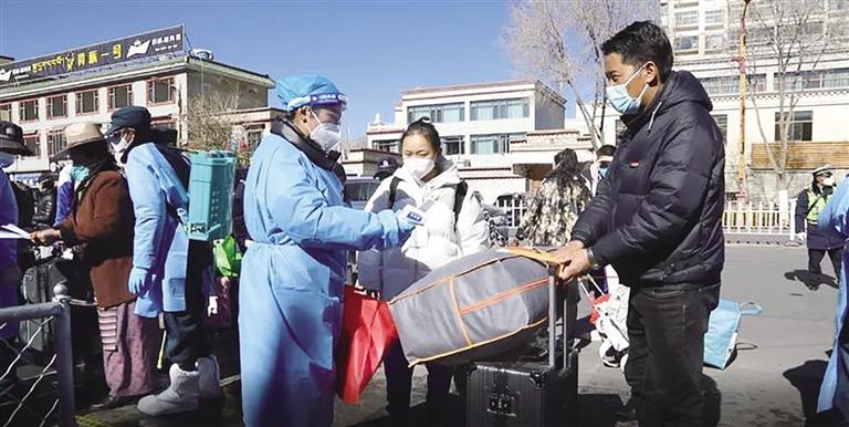 “老師好!”“同學好!”早已等候在校門口的老師一邊向學生打招呼,一邊檢查學生的核酸檢測結果證明以及線下復課同意書簽字情況。另一部分老師則仔細對學生的行李進行消殺。拉薩市第八中學德育副校長昌決表示,返校期間,入校人員必須持有48小時核酸檢測陰性證明,并落實好門口的“一測一掃兩檢查”制度,把好疫情防控第一關。