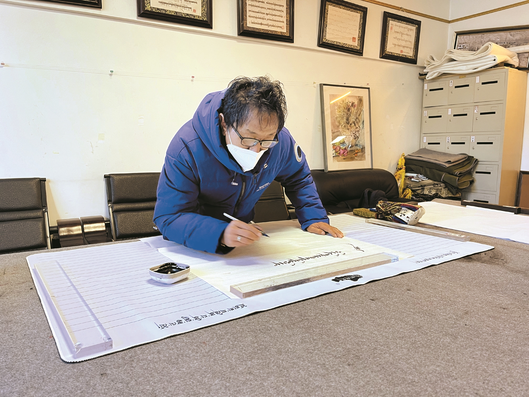 圖為市書法家協會副主席南杰旺扎正在書寫黨的二十大報告金句。 拉薩融媒記者 莫瑞英攝