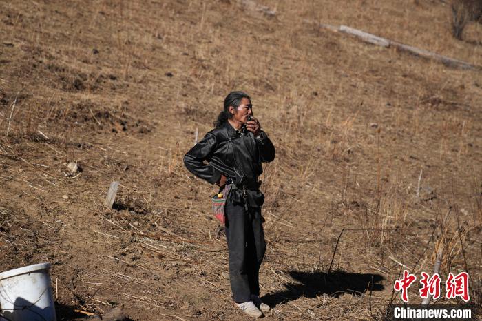 圖為丹增培楚在牧場使用對講機。劉冉陽 攝