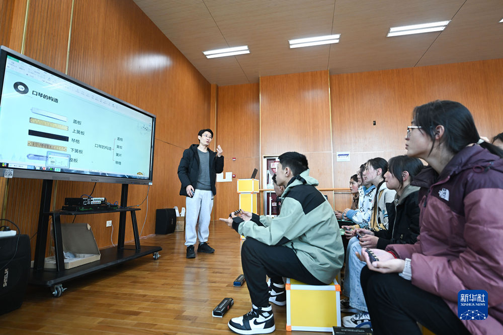 2月23日,上海援青教師闞延俊在給學生上音樂課。新華社記者 張龍 攝