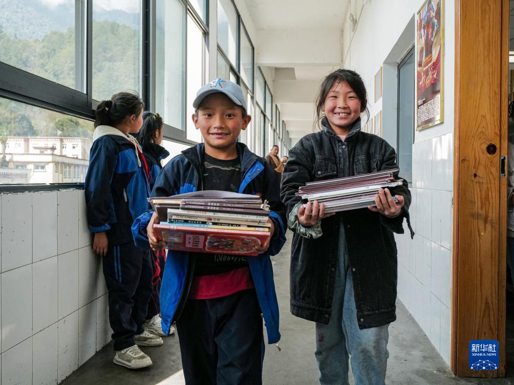 3月31日,學生們正在向教室的圖書角搬運新圖書。新華社記者 洛卓嘉措 攝