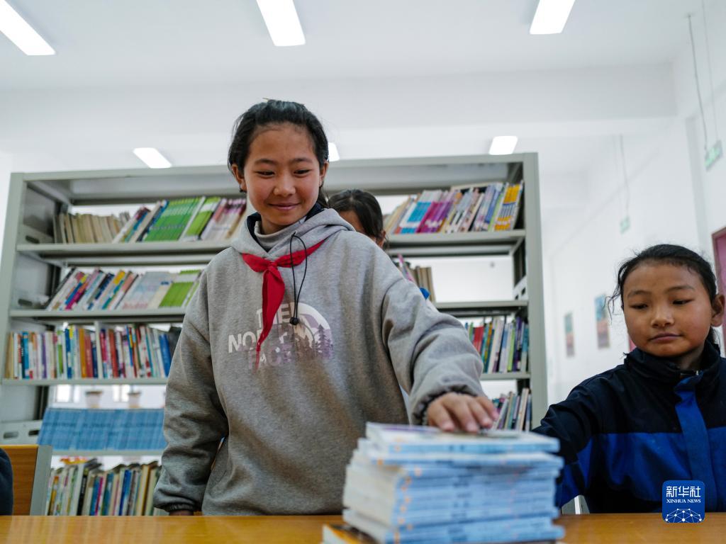 3月31日,下察隅鎮中心小學的學生正在把書放回書架。新華社記者 格桑朗杰 攝