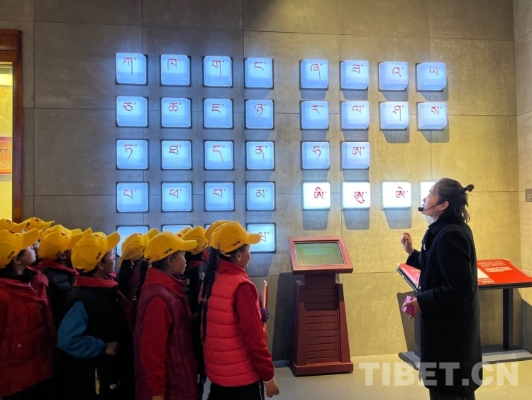走進(jìn)“藏地智慧”,學(xué)生們一眼認(rèn)出藏文創(chuàng)始人吞彌·桑布扎,大家異口同聲回答講解員的問題說:“這是吞彌·桑布扎?!钡玫街v解員的肯定、并向他們講述背后的相關(guān)歷史后,學(xué)生們聽得很入迷,也更有信心面對(duì)接下來的問題。藏文的信息化使得這一古老文字煥發(fā)著全新而旺盛的生命力,在這里學(xué)生們欣賞藏文在智能手機(jī)、電腦、多功能點(diǎn)讀機(jī)等智能電子設(shè)備內(nèi)“走動(dòng)”、傳統(tǒng)農(nóng)牧業(yè)的模擬場(chǎng)景和現(xiàn)代化的機(jī)械設(shè)備圖、藏醫(yī)藥材、藏香藏紙制造和制鹽過程等獨(dú)具特色的藏族傳統(tǒng)手工藝,也能很好的回答講解員提出的問題,現(xiàn)場(chǎng)互動(dòng)氣氛熱烈?!斑@種活動(dòng)我們學(xué)校不會(huì)常有,當(dāng)孩子們聽到要去拉薩時(shí)像是要過年那樣高興,一路上問這問那地充滿好奇?!倍喟奏l(xiāng)小學(xué)的帶隊(duì)老師羅珍介紹:“這次參加活動(dòng)的這些學(xué)生都是三、四、五年級(jí)的學(xué)生,個(gè)個(gè)品學(xué)兼優(yōu)。”