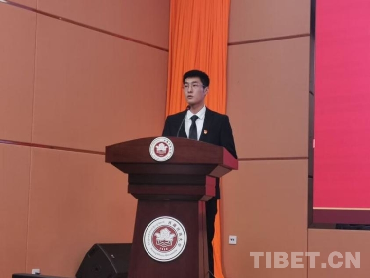 圖為劉陽作為學(xué)生代表在西藏民族大學(xué)演講