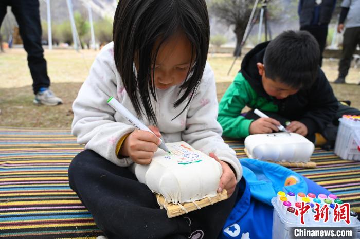 圖為兒童體驗羊皮筏彩繪。 趙朗 攝