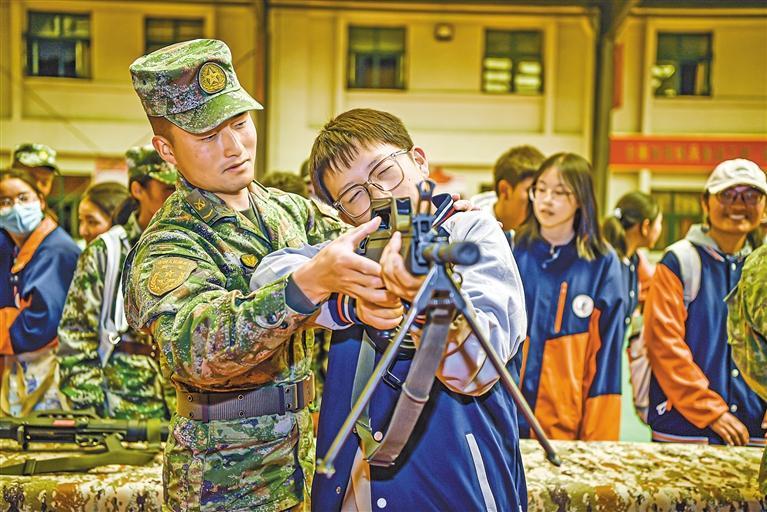 走進綠色軍營,感悟軍旅生活。活動中,近200名師生共赴軍營,師生在解說員的引導下,先后參觀了軍史館、軍史長廊、官兵宿舍等,對常規武器裝備、單個軍人隊列動作等親身體驗,真實地感受了軍人訓練生活。“國無防不立,民無兵不安。”來自日喀則市第三高級中學的學生旦增扎西說,“國防教育活動讓我對駐地部隊有了更深的了解,對金珠瑪米有了更深的認識。”