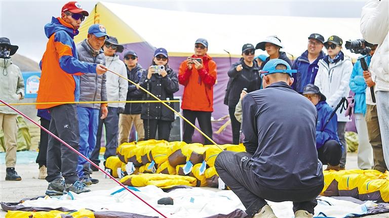 圖為西藏自治區登山隊工作人員在搭建帳篷。記者 鄭璐 袁海霞 攝