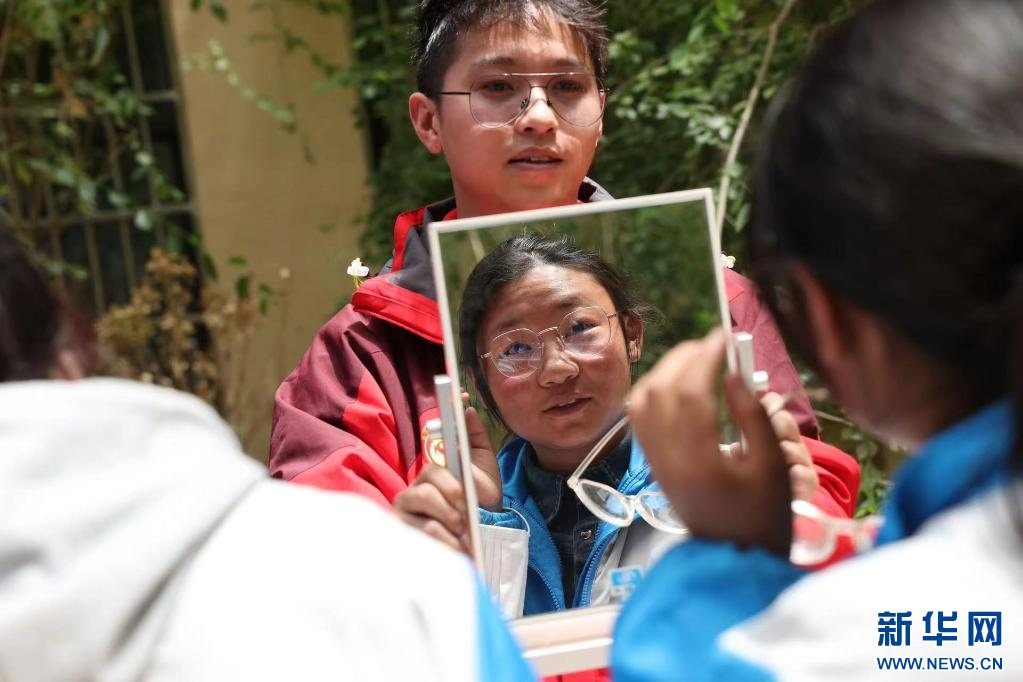 ?? 在西藏自治區那曲市色尼區第二中學(杭嘉中學),志愿者狄璐琬正引導戴上試戴架的學生適應眼鏡清晰度(6月22日攝)。新華社發(趙穎碩 攝)