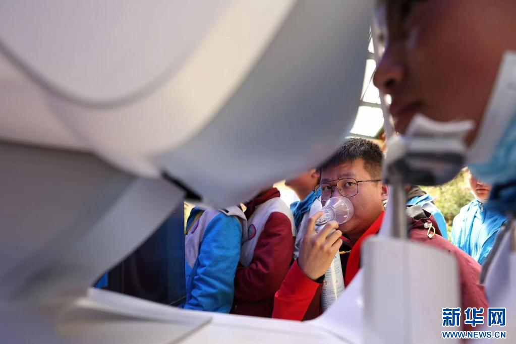 在西藏自治區那曲市色尼區第二中學(杭嘉中學),志愿者陳坤一邊吸氧一邊為學生驗光(6月22日攝)。新華社發(趙穎碩 攝)