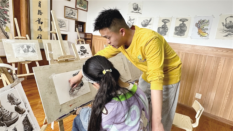 “‘西瓜老師’,這個面包是我特意帶給你的,你餓的時候一定吃。”“‘西瓜老師’,你看我今天畫得怎么樣?有沒有進步?”“‘西瓜老師’,這個地方我不會畫,你能不能教教我?”……課余時間里,陳寶佳經(jīng)常和孩子們一起玩耍,慢慢就成為了孩子們的好朋友。陳寶佳說:“雖然平時會和他們在一起說說笑笑,但是上課的時候我還是比較嚴(yán)厲的。我主要帶素描課,要引導(dǎo)孩子們打好繪畫基礎(chǔ)、練好基本功,今后他們才能在繪畫方面有更多的發(fā)展。看到孩子們畫畫有進步的時候,我會覺得很幸福。”