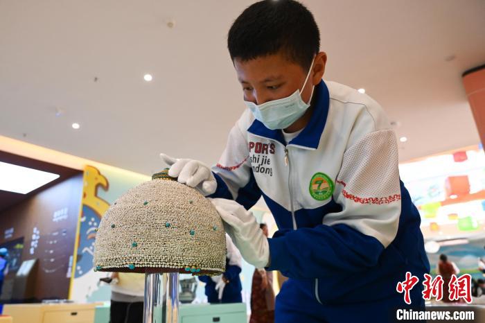2022年7月,一名學(xué)生在西藏博物館觸摸體驗仿真文物。中新社記者 趙朗 攝