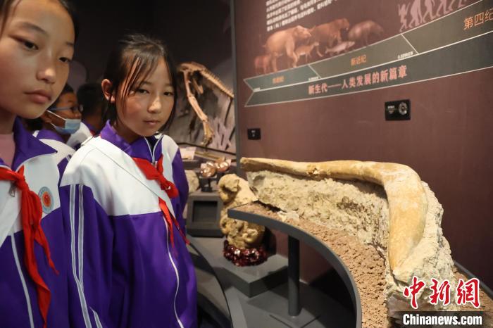 圖為青少年了解產自青海省的黃河象牙化石。張添福 攝