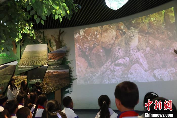 圖為青少年觀看高原旗艦物種雪豹的視頻。張添福 攝