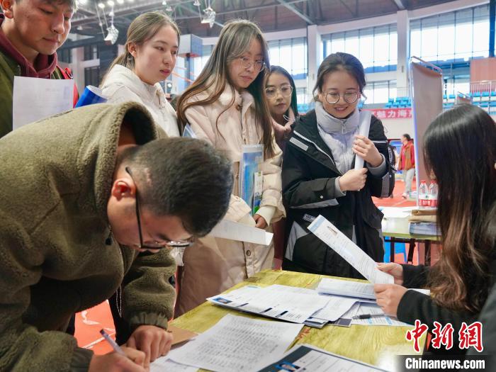 圖為招聘會現場,畢業生正在填寫信息?!⒀?攝