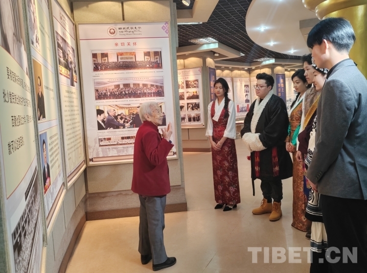 圖為西藏民族大學老教師為學生講解西藏民族大學建校歷程