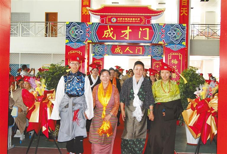 圖為老師和父母牽著孩子們的手一同走過(guò)成人門、成才門、成功門。記者 央金 攝