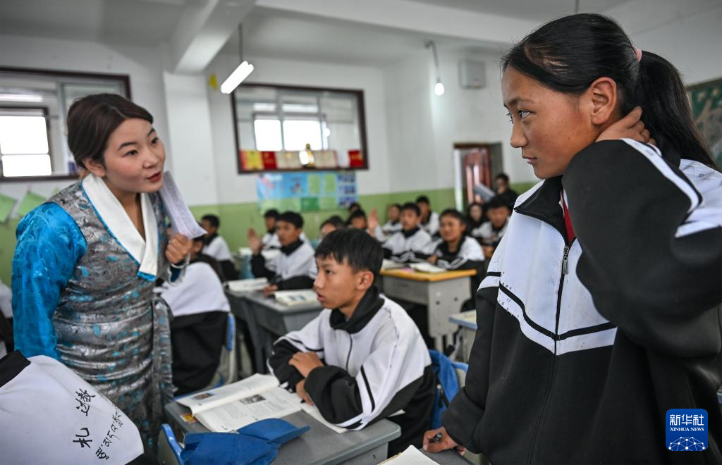 在西藏阿里地區(qū)札達縣九年一貫制學校,老師次仁曲加給初三(2)班的學生上課(9月10日攝)。新華社記者 孫瑞博 攝