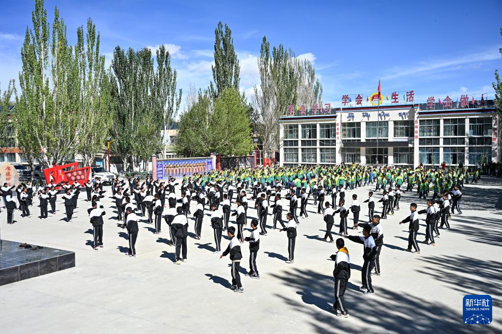 在西藏阿里地區(qū)札達縣九年一貫制學校,孩子們跳起融入國家級非物質(zhì)文化遺產(chǎn)“宣舞”特色的課間操(9月10日攝)。新華社記者 孫瑞博 攝