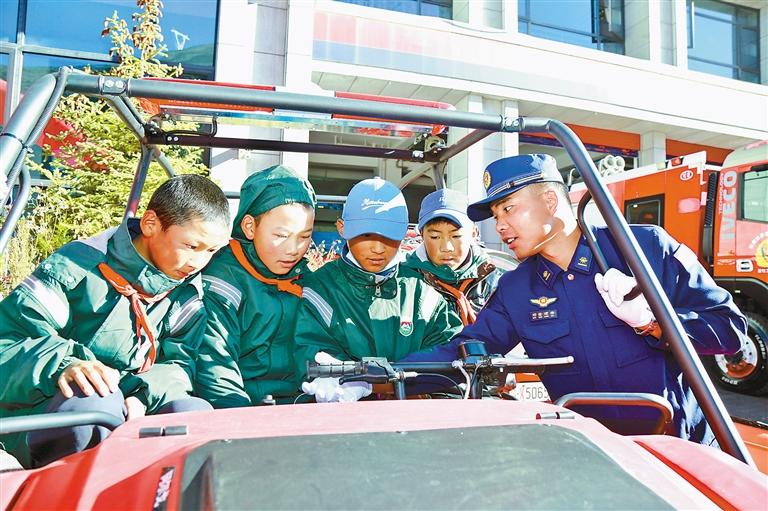 圖為消防員為學生講解消防器材使用方法。記者 格桑倫珠 攝
