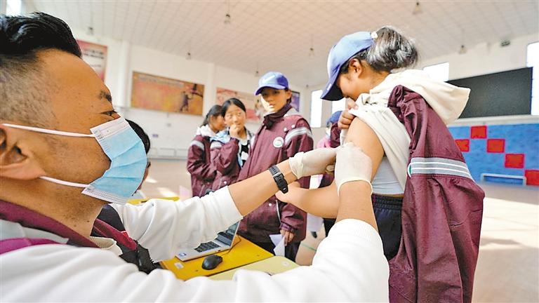 接種疫苗后,醫(yī)生在留觀區(qū)為學(xué)生測(cè)量體溫。記者 格桑倫珠 攝