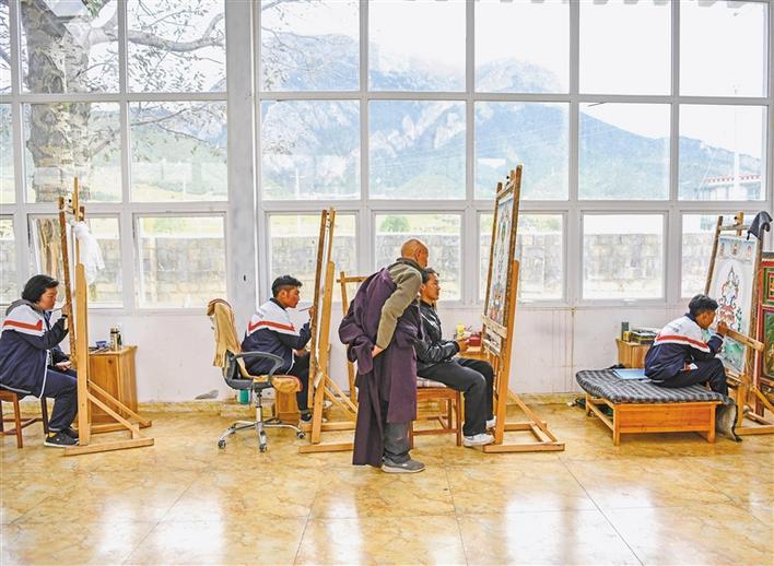 圖為嘎瑪德勒老人在教學員們畫唐卡。 新華社記者 晉美多吉 攝