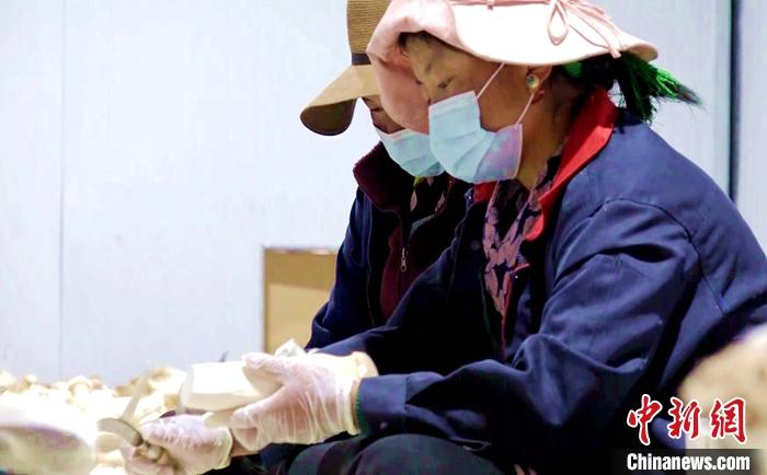 圖為11月17日,西藏日喀則市謝通門縣農牧民在該縣一生物科技企業清理食用菌。中新社記者 貢桑拉姆 攝