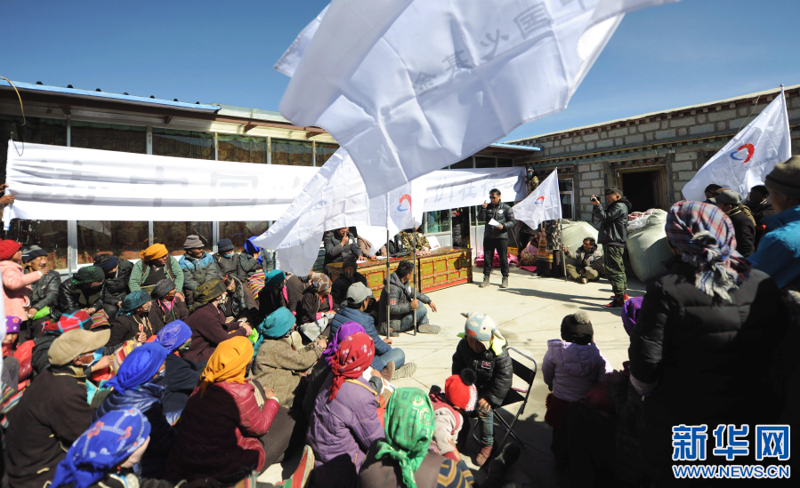 西藏山南市浪卡子縣浪卡子鎮道布龍居委會里,駐村工作隊隊員在給村民講入股居委會集體經濟的事情。(2018年2月12日攝)新華社記者 晉美多吉 攝