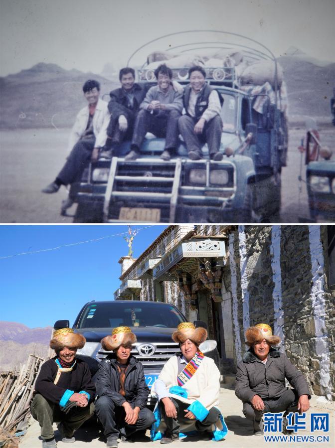 拼版照片:上圖:1994年,24歲的強巴(右二)和他的三個兄弟在西藏阿里地區跑運輸時,在自己購買的“東風”牌運輸車前合影(強巴提供)。(新華社發)