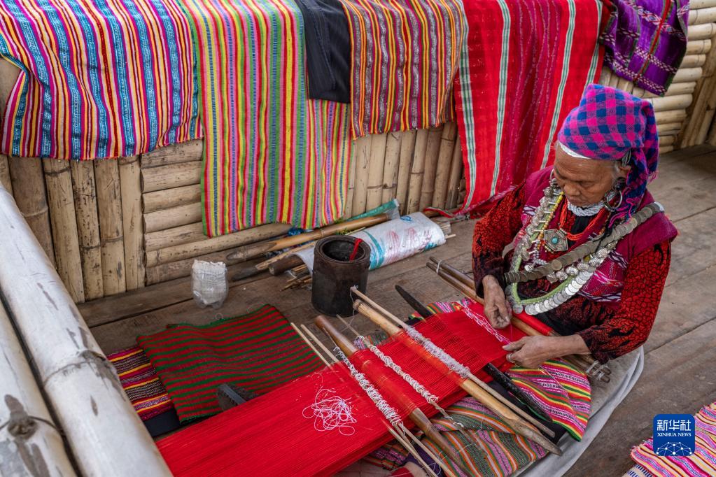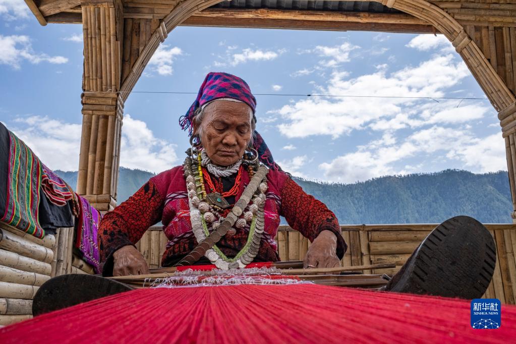 今年72歲的本央老人,是僜人服飾制作技藝西藏自治區級非遺傳承人。在西藏林芝市察隅縣沙瓊村,老人身著傳統的僜人服飾,在自家的涼亭里編織布料。