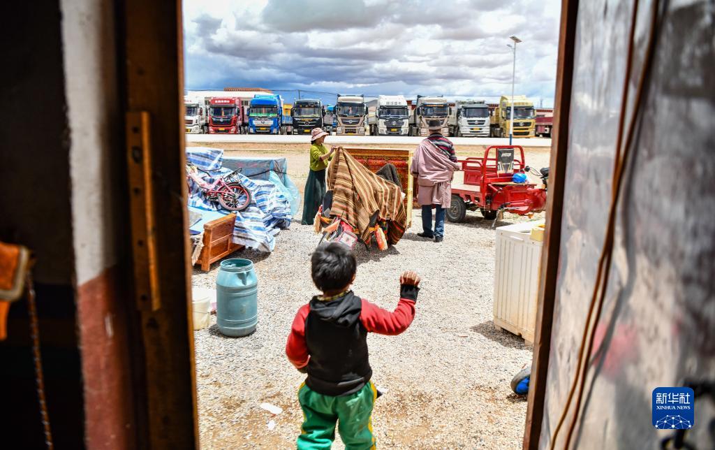 在雙湖縣多瑪鄉仲魯瑪村,運輸家具的貨車整裝待發(7月13日攝,無人機照片)。新華社記者 晉美多吉 攝