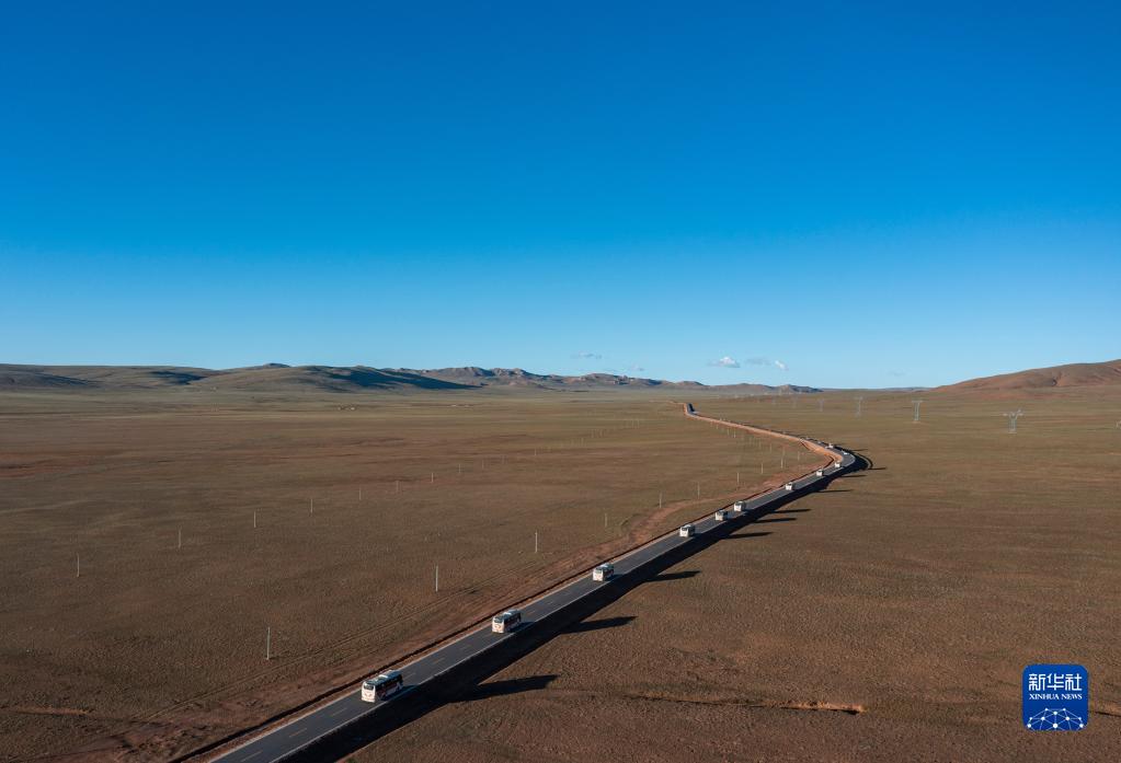 從雙湖縣出發的車隊行駛在前往森布日安置點的道路上(7月19日攝,無人機照片)。新華社記者 孫非 攝